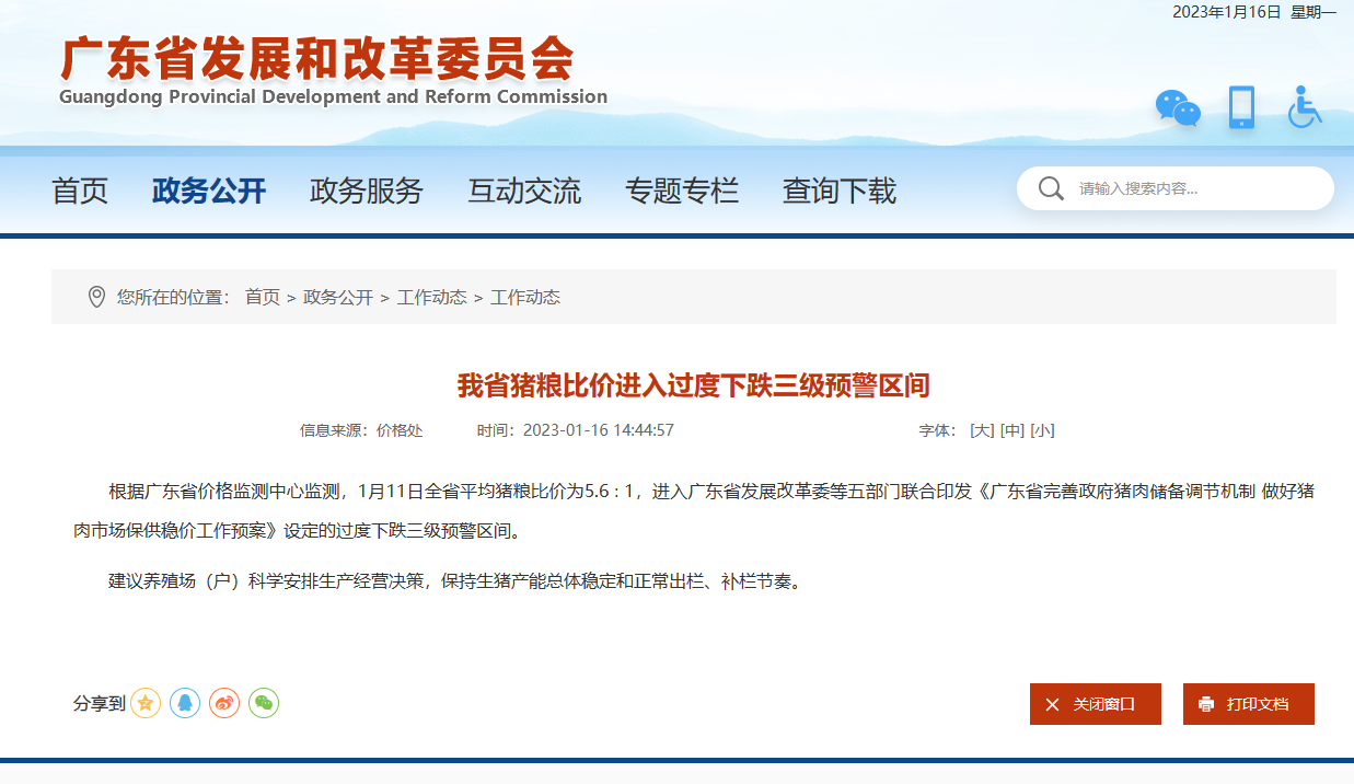 广东发改委消息,根据广东省价格监测中心监测,1月11日全省平均猪粮比价为5.6∶1,进入广东省发展改革委等五部门联合印发《广东省完善政府猪肉储备调节机制做好猪肉市场保供稳价工作预案》设定的过度下跌三级预警区间。
