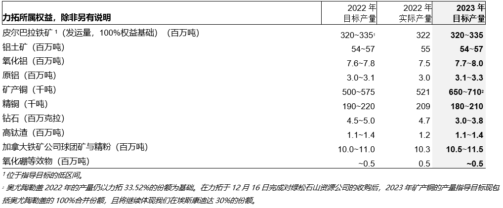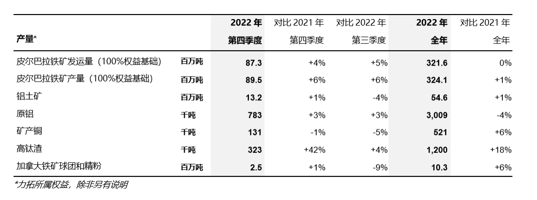 力拓2022年第四季度生产业绩情况表