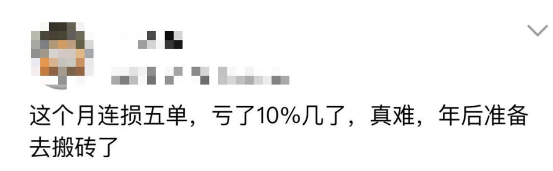 有投资者表示,连亏五单,年后准备去搬砖了;有人对自己的交易成绩不满意:很多天没有日入过万了,只能做到日入过千,感觉太少了!