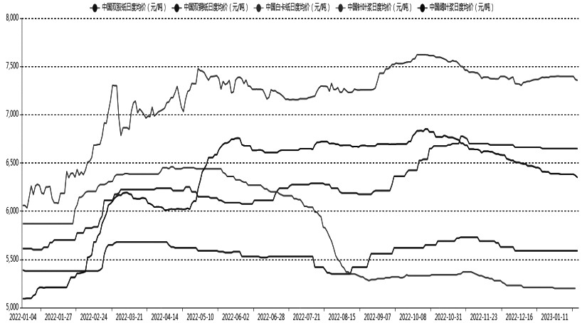 从国内市场来看,2022年12月,我国机制纸及纸板产量为1202.7万吨,环比增长0.6%,同比下降4.8%。2022年全年,累积机制纸及纸板产量为13691.4万吨,同比下降1.3%,同比连续7个月下降。虽然2022年下游需求情况整体弱于前年,但是新年度受成品纸新增产能支撑,预计全年纸浆需求相对好转。1月下游纸企停机较多,开工负荷率较上月大幅走低,终端需求整体下降明显,预计元宵节后市场供需逐渐恢复。据相关机构观测,文化用纸方面,部分纸企接单向好,有挺价调涨意向;生活用纸方面,春节后下游适量补库,但是需求放量预期或难持续;包装用纸方面,春节前下游普遍备货不多,春节后市场刚性需求将增加。