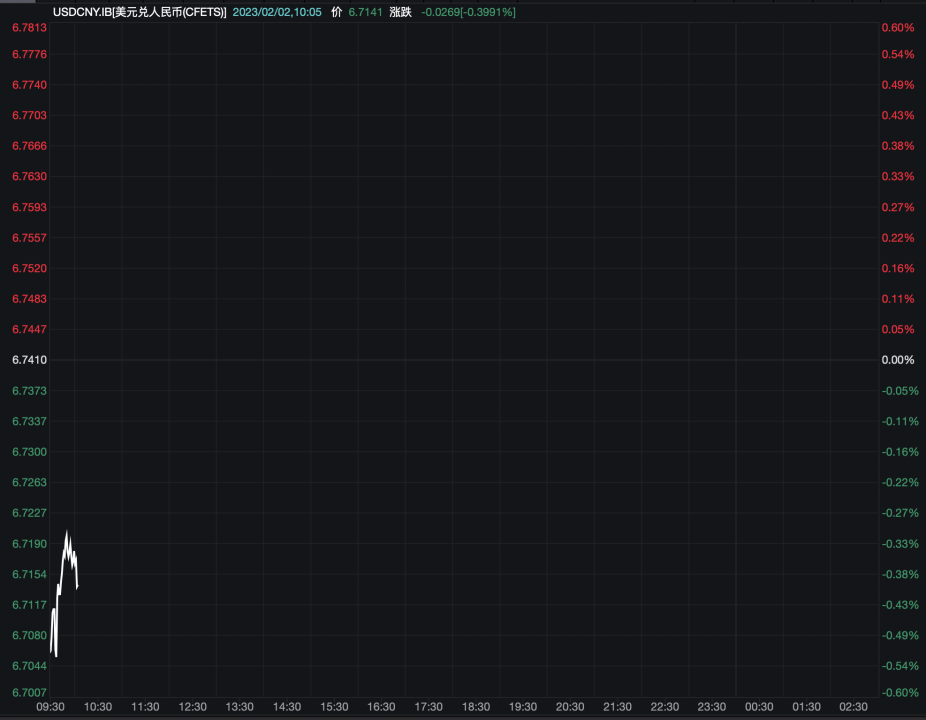 2023年以来,人民币兑美元市场汇率逐步攀升,截至2月2日11:30,在岸人民币兑美元汇率已累计上涨2384个基点,涨幅超3%;离岸人民币兑美元汇率累计上涨2039个基点,涨幅近3%。