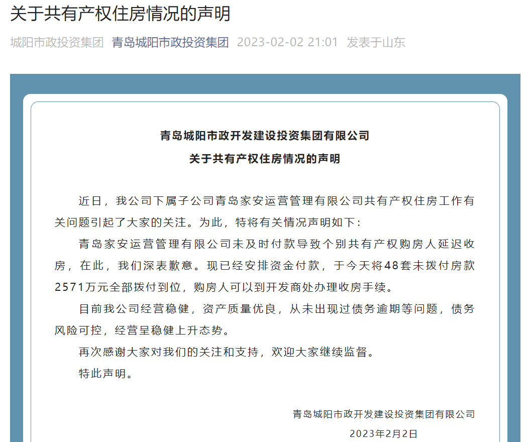 声明称,青岛家安运营管理有限公司未及时付款导致个别共有产权购房人延迟收房,在此,我们深表歉意。现已经安排资金付款,于今天将48套未拨付房款2571万元全部拨付到位,购房人可以到开发商处办理收房手续。