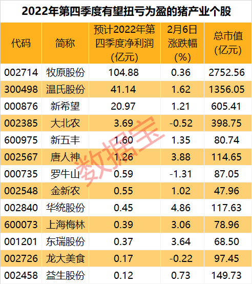 证券时报·数据宝统计,根据上市公司披露的业绩预告,12家猪企预告净利润同比增幅在100%以上,禾丰股份、华统股份、广弘控股预计增幅居前。