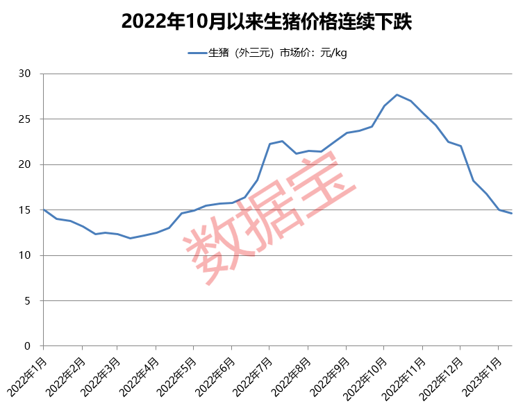 国家统计局数据显示,截至1月中旬,全国生猪(外三元)为14.6元/千克,价格创下近八个月以来新低,环比1月上旬下降2.7%,在农副产品中下降幅度最高,已连续9期环比下降,较去年10月中旬的年内高点下降了47.29%,价格接近腰斩。