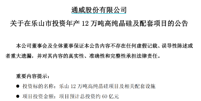 通威股份公告显示,该公司拟与乐山市政府、乐山市五通桥区政府共同签署《投资协议》,就公司在乐山市新增投资约60亿元,建设年产12万吨高纯晶硅项目及相关配套设施达成合作。