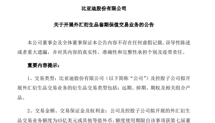 比亚迪在公告中表示,公司及控股子公司开展的外汇衍生品交易业务与日常经营需求紧密相关,是基于外币资产、负债状况以及外汇收支业务情况具体开展。公司及控股子公司进行适当的外汇衍生品交易业务能够提高积极应对外汇波动风险的能力,更好的规避汇率风险、利率风险,增强财务稳健性。