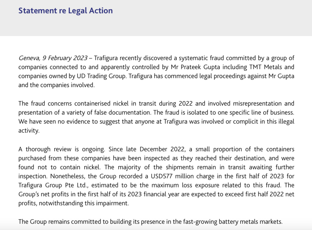 当地时间2月9日,全球商品贸易巨头托克(Trafigura)在官网发布声明称,公司在镍交易过程中碰上了一起骗局。公司预期最多可能造成5.77亿美元(约合人民币39亿元)的损失,并将计入2023年上半年的财报中。