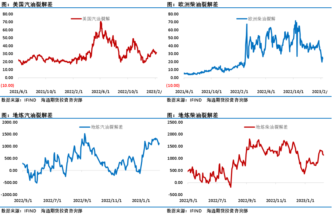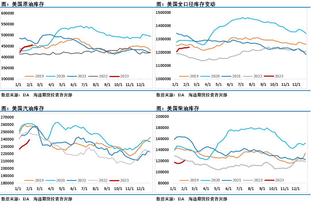 与供应端密集的利多影响不同,最新一期的EIA周度数据显示,截至2月3日当周,美国原油成品油库存全面超预期累库;具体数据显示,美国原油库存 242.3万桶,预期245.7万桶,俄克拉荷马州库欣原油库存 104.3万桶,。精炼油库存 293.2万桶,预期9.7万桶;汽油库存 500.8万桶,预期127.1万桶。其中商业原油库存为2021年6月18日当周以来最高,精炼油库存增幅、汽油库存增幅均录得2022年12月2日当周以来最大。总体来看,2023年以来美国石油市场累库压力是近几年来最大的,需求表现疲软,成品油裂解利润近期明显走弱。