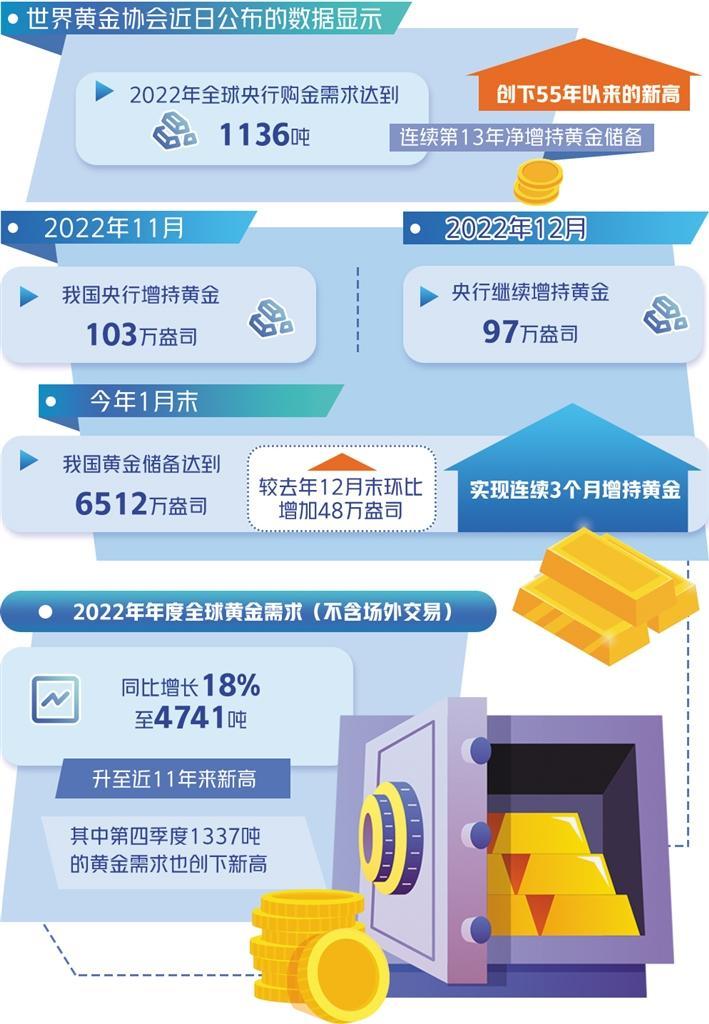 数据显示,2022年11月,我国央行增持黄金103万盎司。而在此之前,我国的黄金储备量自2019年9月开始,连续三年保持在6264万盎司水平。2022年12月,央行继续增持黄金97万盎司。今年1月末,我国黄金储备达到6512万盎司,较去年12月末增加48万盎司,连续3个月增持黄金,增持规模达到248万盎司。受此影响,1月末中国黄金储备估值达到1252.83亿美元,较去年年底的1172.35亿美元环比增加80.48亿美元,引来较多关注。