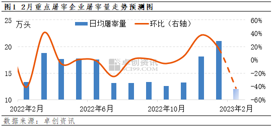 2月份正值春节过后的传统消费淡季,需求量整体缩水。卓创资讯预计2月份日均屠宰量在12.00万头左右,环比下降9.09万头,按照样本占比推算,2月份全国生猪屠宰量降幅或在39%左右。