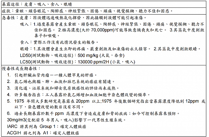 根据台湾氯乙烯工业股份有限公司的安全资料表,人体在暴露于氯乙烯后,会出现昏眩、头昏眼花等症状,慢毒性包括肝癌和脑、肺、血液和淋巴系统的癌症等。