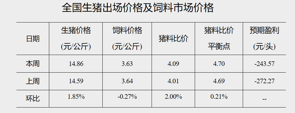 据国家发展和改革委员会价格监测中心、卓创资讯联合监测,截至2月15日当周,全国猪料比价为4.09,环比上涨2.00%。按目前价格及成本推算,未来生猪养殖头均亏损为243.57元,国内猪价呈先涨后降走势。上半周,在养殖单位惜售以及屠宰企业开工率逐步提升的共同带动下,国内多数地区猪价小幅走高;下半周,终端市场走货难以跟进,屠宰企业试探性压价收购,猪价稍有回落,但降幅有限。短期内供需博弈激烈,预计猪价或延续窄幅调整态势,猪料比或缓涨。