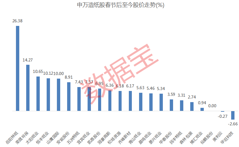 将时间线拉长,春节后至今,造纸指数累计上涨7.48%。概念股中,岳阳林纸涨幅居首,为26.38%;荣晟环保、太阳纸业、恒丰纸业、山鹰国际等多股涨逾10%。仅美利云与华旺科技两股股价下跌,幅度均不足3%。
