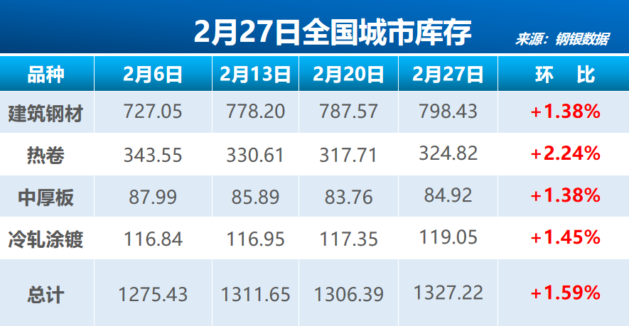 钢银电商27日公布数据显示,截至2月27日的一周,国内39个城市,共计146个仓库的钢铁总库存量为1327.22万吨,环比增加20.83万吨,增加1.59%。