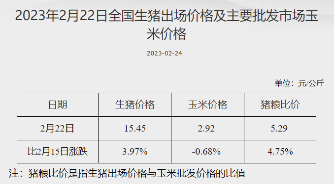 据国家发改委数据,截至2月22日,全国生猪出场价格为15.45元/公斤,比2月15日上涨3.97%;主要批发市场玉米价格为2.92元/公斤,比2月15日下跌0.68%;猪粮比价为5.29,比2月15日上涨4.75%。