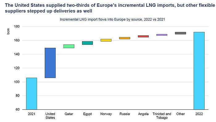欧洲去年的LNG进口量飙升63%,增加了660亿立方米。新增进口中有三分之二来自美国,其余三分之一来自卡塔尔、埃及、挪威、俄罗斯等。