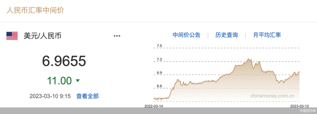 3月10日,央行授权中国外汇交易中心公布,2023年3月10日银行间外汇市场人民币汇率中间价为:1美元对人民币6.9655元,前一交易日中间价报6.9666元,单日调升11基点。此前,人民币中间价连续三个交易日调贬,本周累计调贬538基点。