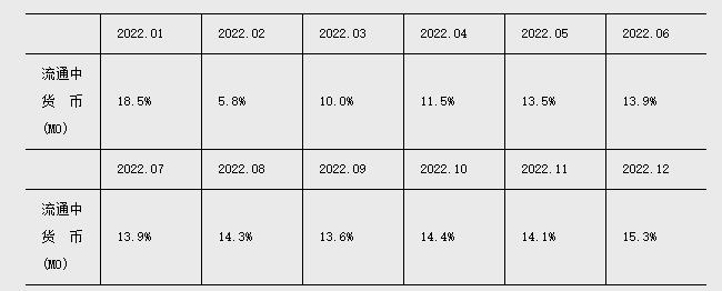 注4:自2022年12月起,“流通中货币(M0)”含流通中数字人民币。12月末流通中数字人民币余额为136.1亿元。修订后,2022年各月末M1、M2增速无明显变化。修订后M0增速如下: