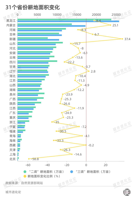 进一步看31个省份的耕地情况,2009到2019年的十年时间,全国仅内蒙古、新疆、黑龙江、吉林、辽宁五个省份耕地面积增加,其余26个省份耕地面积减少。