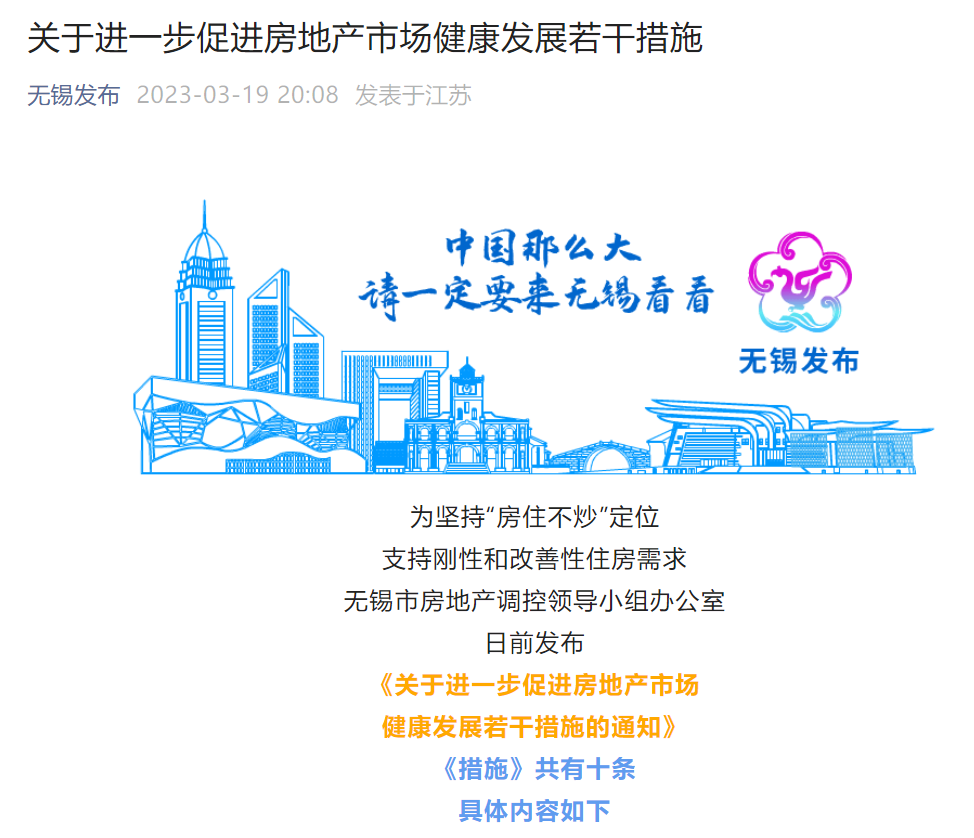 3月19日,无锡发布稳楼市新政,包括降低购房门槛、调整限购区域、换购住房个税优惠、降低首套房贷利率等10项措施。