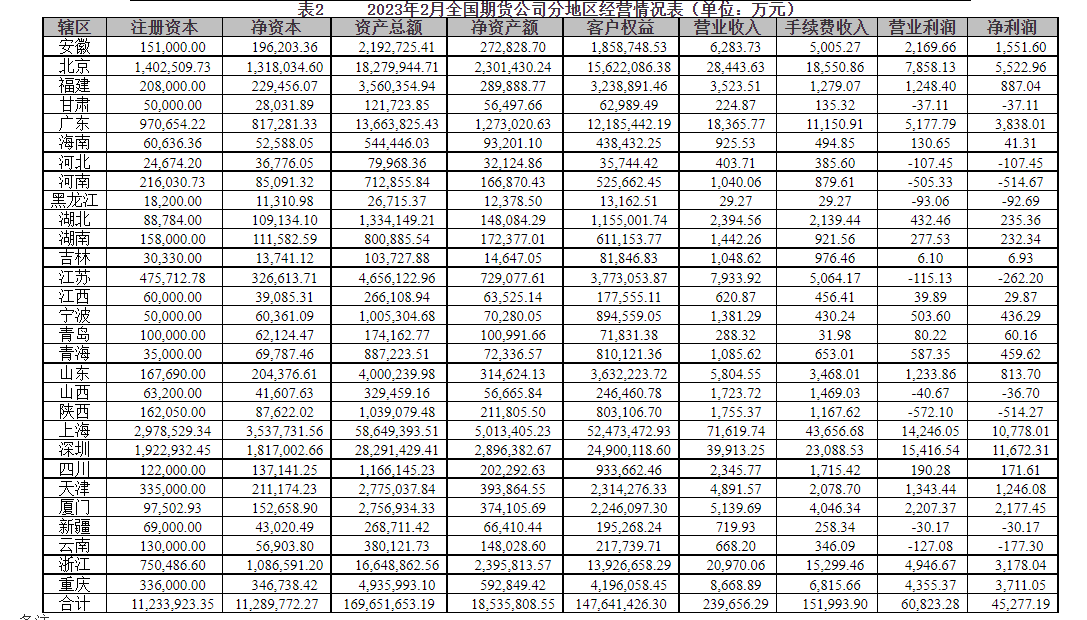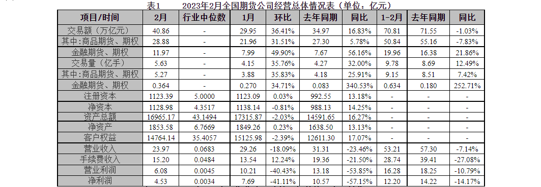 中国期货业协会最新发布的2023年2月期货公司总体及分辖区经营情况显示,2月全国150家期货公司实现净利润4.53亿元,同比减少57.15%,环比减少41.11%;营业收入23.97亿元,同比减少23.46%,环比减少18.09%。