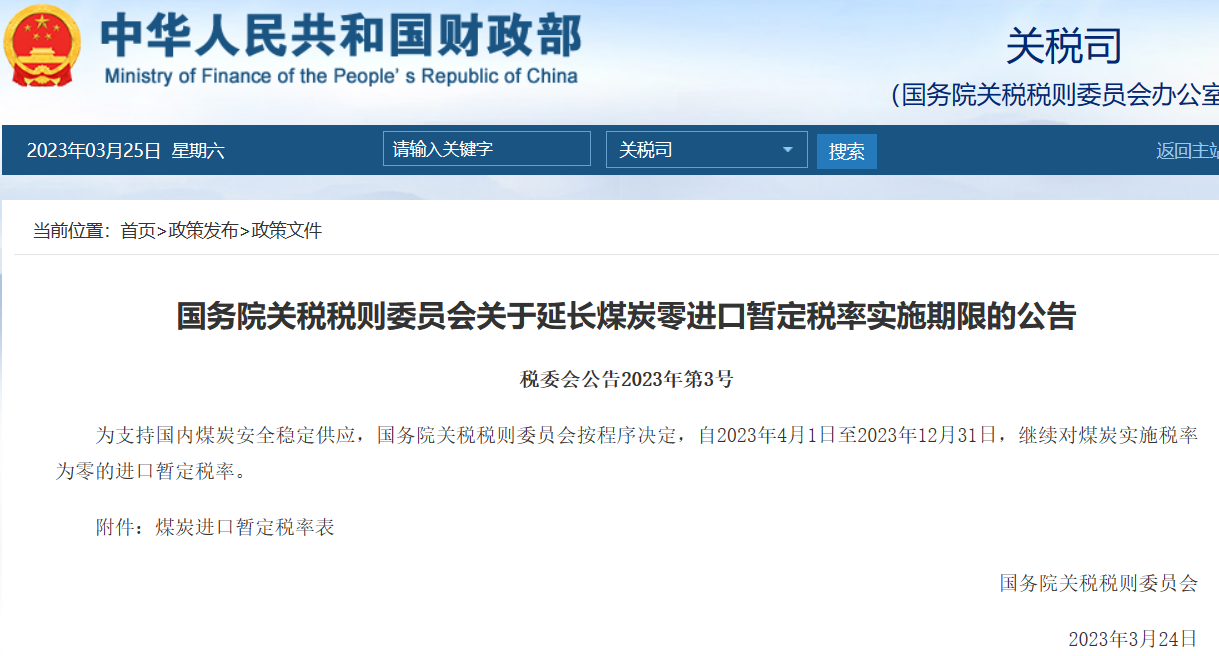 据财政部网站消息,为支持国内煤炭安全稳定供应,国务院关税税则委员会按程序决定,自2023年4月1日至2023年12月31日,继续对煤炭实施税率为零的进口暂定税率。