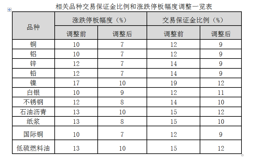 4月4日,上海期货交易所(下称“上期所”)、上海国际能源交易中心发布《关于调整铜等期货交易保证金比例和涨跌停板幅度的通知》《关于调整国际铜、低硫燃料油期货交易保证金比例和涨跌停板幅度的通知》,调整了铜、镍、不锈钢、纸浆、白银等11个品种的风控参数。