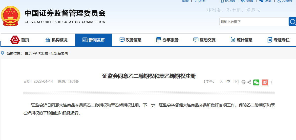 证监会同意乙二醇期权和苯乙烯期权注册