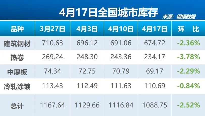据钢银电商17日公布的数据,截至4月17日的一周,全国39个城市,共计146个仓库城市钢铁总库存量为1088.75万吨,环比减少28.09万吨,降幅2.52%。