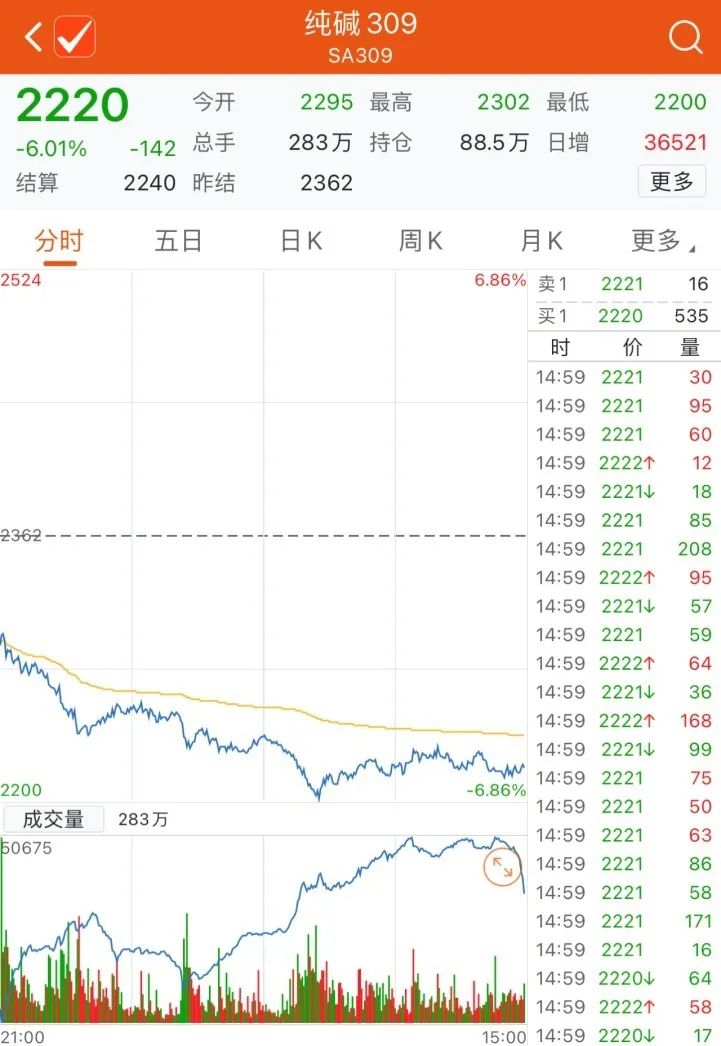 4月20日,截至日间交易收盘,纯碱期货主力合约2309跌超6%,刷新去年6月以来新低。