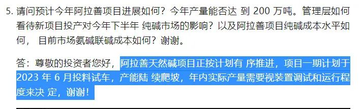 对于上述传言,远新能源表示,阿拉善天然碱项目正按计划有序推进,项目一期计划于2023年6月投料试车,产能陆续爬坡,年内实际产量需要视装置调试和运行程度来决定。