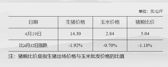 据国家发改委数据,截至4月19日,全国生猪出场价格为14.30元/公斤,比4月12日下跌1.92%;主要批发市场玉米价格为2.84元/公斤,比4月12日下跌0.70%;猪粮比价为5.04,比4月12日下跌1.18%。