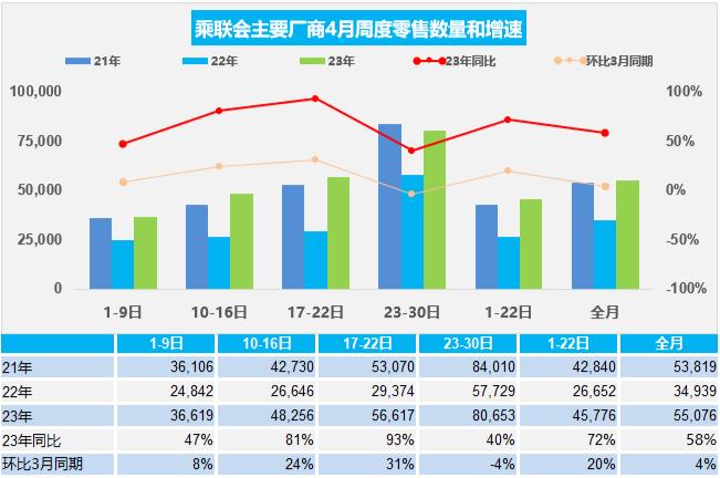 初步统计,4月1-30日,乘用车市场零售165.2万辆,同比增长58%,环比增长4%;今年以来累计零售593.8万辆,同比增长持平。