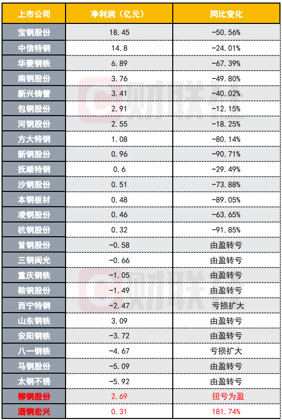 上市钢铁冶炼企业一季度利润及变化情况(数据来源:上市公司一季报)