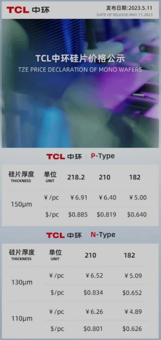 实际上,拉长时间来看,硅片环节降价更为明显。硅片龙头之一TCL中环最新报价也印证了这一现象。