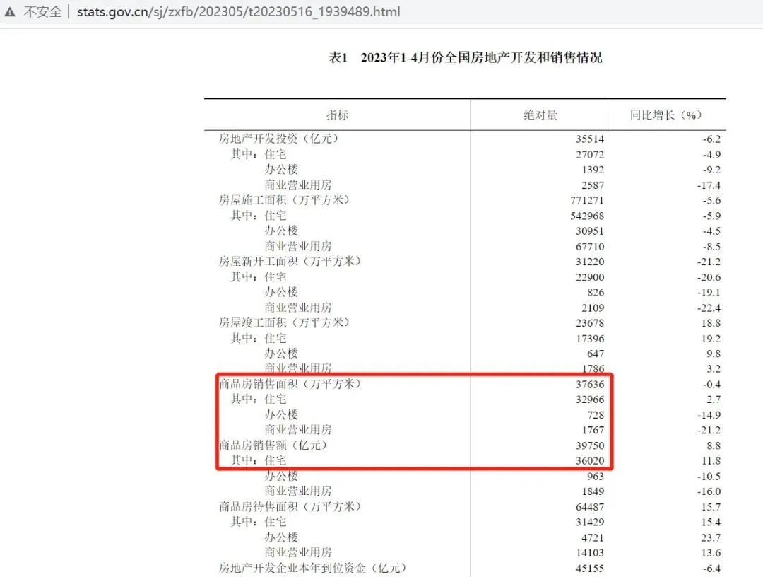 2023年1-4月份全国房地产开发和销售情况,截图来源:国家统计局网站