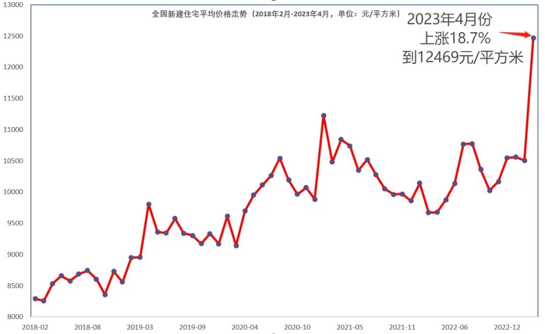 用同样的方法,能算出3月份全国商品房住宅销售平均价格是10505元/平方米,4月份的销售均价比3月份销售均价上涨了18.7%。这是2018年以后第一次出现。