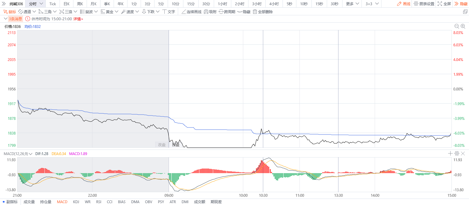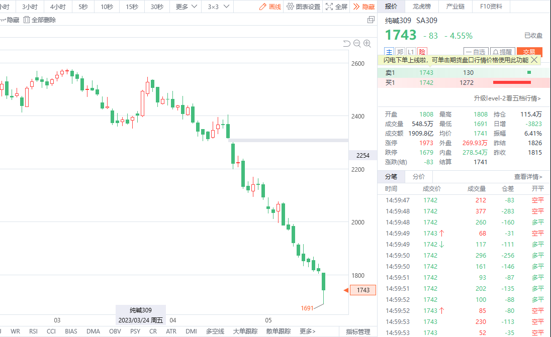 今日,郑州商品交易所纯碱期货近月合约2306在开盘后15分钟便砸向跌停板,于9点14分时封死跌停板,跌幅8.03%。在上午10点06分后才打开跌停板,除合约2306外,合约2307也出现较大跌幅近7.88%,逼近跌停板,主力合约2309也在9点15分左右跌幅达7.23%。