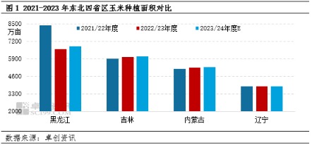 据黑龙江部分农户反映,由于玉米田间种植便于管理,产量较为稳定,以及去年大豆盈利不佳,今年玉米种植意愿明显提升。卓创资讯初步评估,黑龙江玉米种植面积约为6819万亩,较上年增加3.00%;吉林地区种植意向稳定,玉米种植面积约为6100万亩,较上年增加1.23%;内蒙古部分地区虽有杂粮改种现象,但面积相对有限,玉米种植面积在5300万亩左右,同比增幅仅为0.68%;辽宁部分沙地改种花生,种植面积在3860万亩左右,较上年减少0.04%。综合来看,2023/24年度东北四省区玉米种植总面积约为22079万亩,较去年增加309.55万亩(或1.42%)。