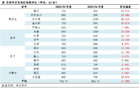 东北玉米的种植成本主要包括地租、化肥、种子、农药、机械、水电等要素。卓创资讯调研黑龙江、吉林、辽宁、内蒙古4省区17余市70多个区县,数据显示,由于农作物价格处于近年来相对高位,地租基本维持上涨趋势,涨幅在4.48%-42.86%不等,部分优质地块地租上涨较为明显,2023/24年度东北平均地租在864.71元/亩,较去年涨130元/亩(或17.69%)。