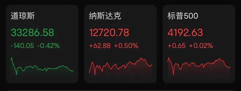 当地时间周一,美股市场整体在观望情绪中震荡,三大指数涨跌不一:截至收盘,道指收跌140.05点,跌幅0.42%,报33286.58点;纳指收涨62.88点,涨幅0.50%,报12720.78点;标普500指数收涨0.65点,涨幅0.02%,报4192.63点。