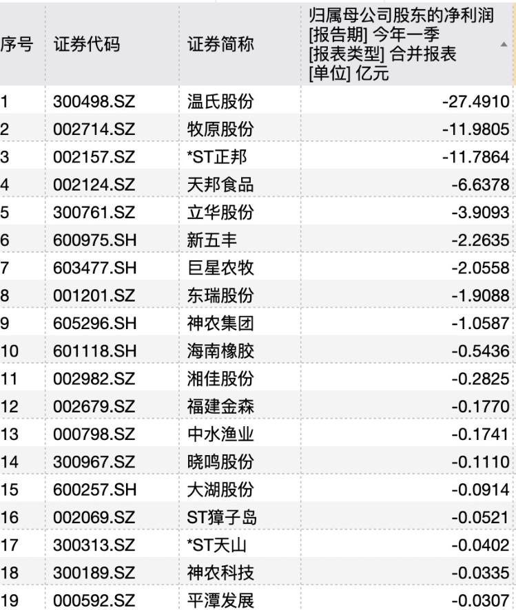 具体来看,牧原股份一季度营业收入241.98亿元,同比增长32.39%,归母净利润-11.98亿元;温氏股份一季度营业收入199.74亿元,同比增长36.92%,归母净利润-27.49亿元;一季度,新希望、正邦分别亏损16.86亿元和11.79亿元。