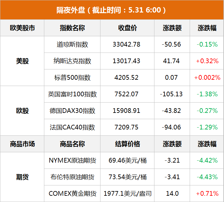 原油:WTI 7月原油期货收跌3.21美元,跌幅4.42%,报69.46美元/桶。布伦特7月原油期货收跌3.41美元,跌幅4.43%,报73.54美元/桶。
