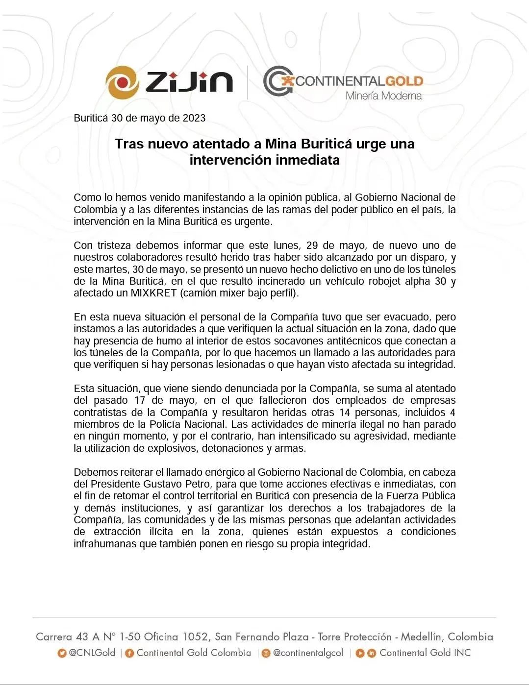 紫金矿业子公司大陆黄金(Continental Gold)5月31日在其官方社交媒体账号上发布通告称,公司旗下位于哥伦比亚的武里蒂卡金矿5月30日再度遭遇袭击。非法采矿组织利用炸药和武器加大了袭击力度,敦促哥伦比亚当局采取行动。这是武里蒂卡金矿区在本周内第二次遇袭。根据声明,本周一即5月29日,一名工人遭枪击受伤。