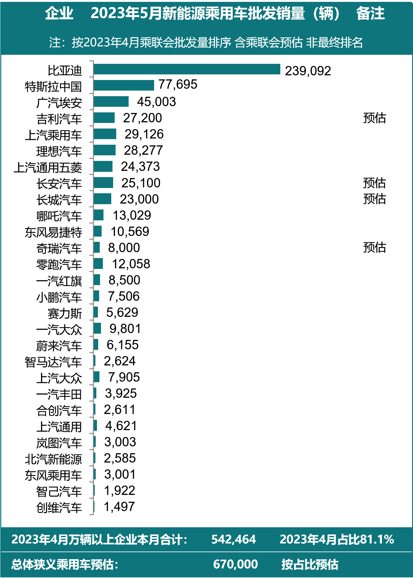 乘联会2023年4月全国乘用车市场,新能源销量万辆以上的11家厂商批发销量占总体新能源乘用车全月销量的81.1%,这些企业的5月预估销量为54.2万辆,按照正常结构占比预测5月的全国新能源乘用车销量在65万辆。