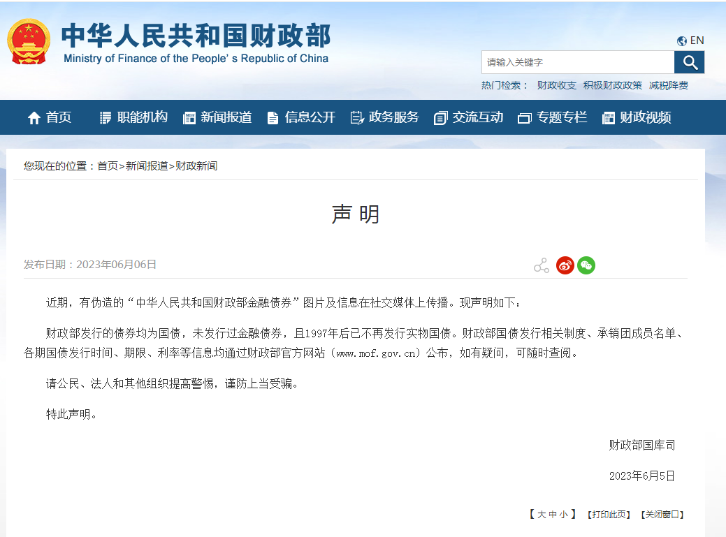 6月6日,财政部网站发布声明,近期,有伪造的“中华人民共和国财政部金融债券”图片及信息在社交媒体上传播。现声明如下: