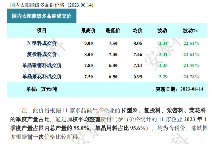 中国有色金属工业协会硅业分会6月14日发布多晶硅周评。本周国内N型料价格区间在7.5-9.0万元/吨,成交均价为8.05万元/吨,周环比降幅为22.52%;单晶致密料价格区间在6.80-7.80万元/吨,成交均价为7.24万元/吨,周环比降幅为24.5%。