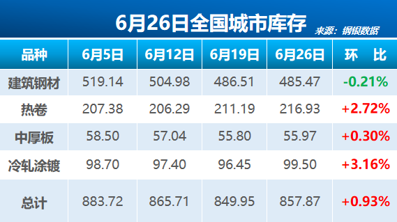 据钢银电商数据显示,截至6月26日,全国钢市总库存量为857.87万吨,较上周环比增加7.92万吨(+0.93%),包含39个城市,共计146个仓库。
