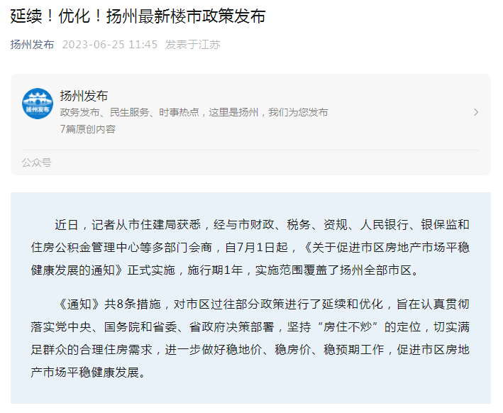 不仅是连云港,近期全国多地陆续出台楼市新政。据微信公众号“扬州发布”6月25日消息,扬州市住建局经与市财政、税务、资规、人民银行、银保监和住房公积金管理中心等多部门会商,自7月1日起,《关于促进市区房地产市场平稳健康发展的通知》正式实施,施行期1年,实施范围覆盖了扬州全部市区。