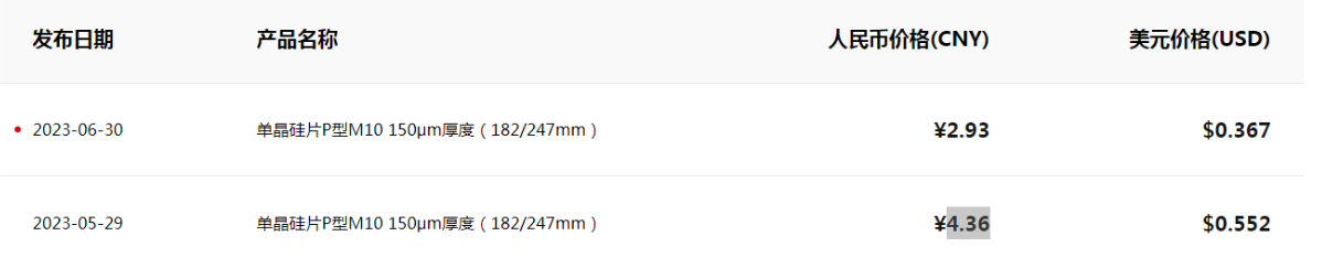 隆基绿能官网6月30日发布6月单晶硅片价格公示,“单晶硅片P型M10 150μm厚度”价格由4.36元人民币下调至2.93元,降幅32.8%。